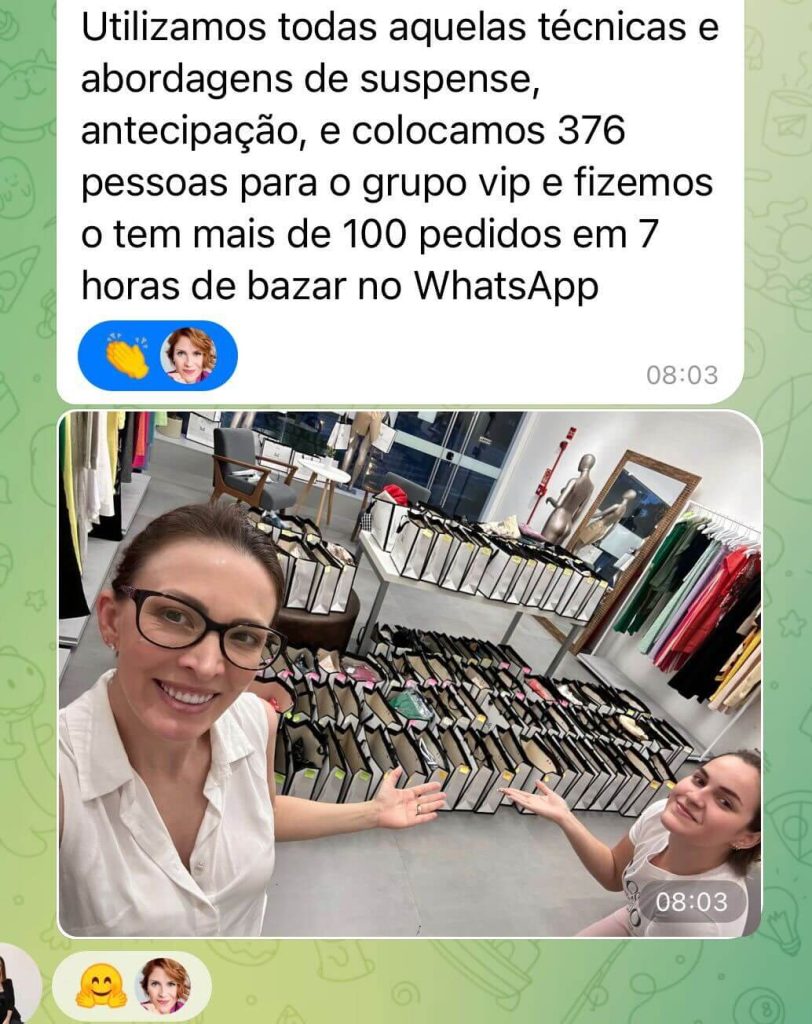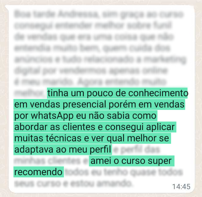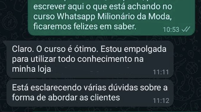 O curso tem aulas curtas, objetivas e dinâmicas com um conteúdo extremamente prático para você aplicar no seu negócio. Você aprenderá como usar os recursos gratuitos do WhatsApp para vender mais os seus produtos de moda; sobre funis e scripts de vendas; também sobre ferramentas de automação e escala.